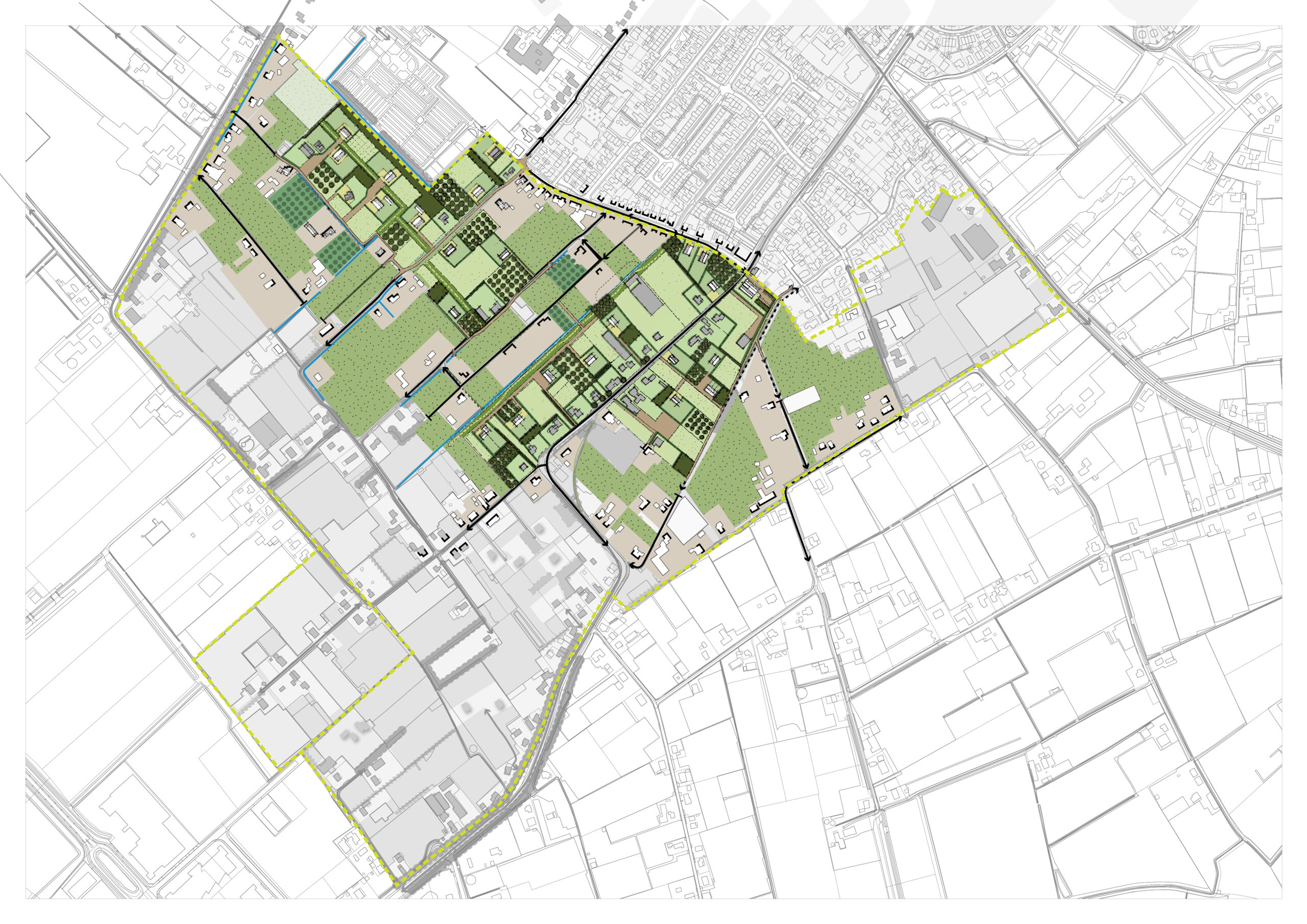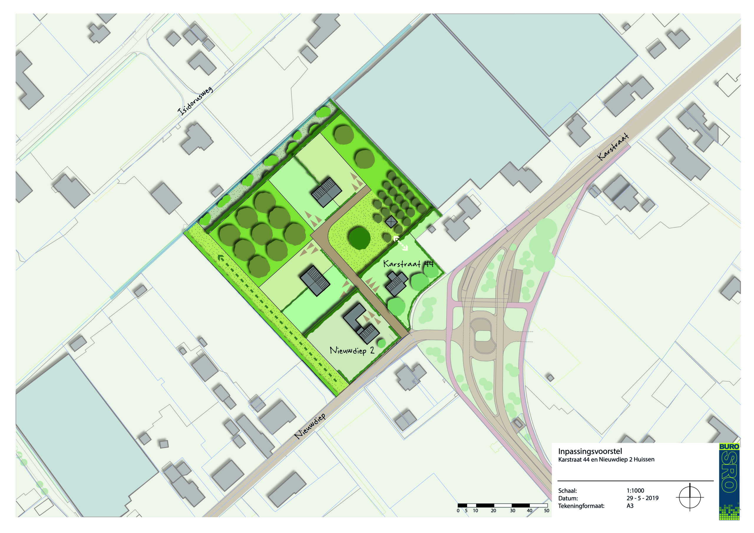 Het gebied ’t Zand aan de rand van Huissen bevat veel glastuinbouw. Omdat de groeimogelijkheden daarvan beperkt zijn is een transformatie wenselijk. De gemeente Lingewaard zet bij die transformatie van glastuinbouw naar kleinschalige woningbouw in op landschappelijke en recreatieve versterking. Buro SRO stelde voor de gemeente een visie op met daarin de spelregels voor grondeigenaren die hun kassen willen vervangen door woningen. In de visie laten we met verschillende ontwikkelscenario’s voor meerdere locaties in het gebied zien welke invulling er kan ontstaan. Centraal uitgangspunt daarbij is steeds het realiseren van kleinschalige woonerven in combinatie met het realiseren van passende landschapselementen zoals boomgaarden, weiden, moestuinen en gebiedseigen erfbeplanting. Kort na het afronden visie hebben we één van de grondeigenaren geholpen bij de daadwerkelijke transformatie van zijn perceel aan de Karstraat 44 door het opstellen van een inrichtingsplan en bestemmingsplan voor de beoogde herontwikkeling. In dat plan hebben we de spelregels uit de visie duidelijk terug laten komen. De twee woonvolumes in dat plan staan samen rond een centrale weide met daarop een tamme kastanje. Andere landschapselementen die we hebben toegepast zijn een Walnotenboomgaard, een gemengde boomgaard een open, groene zichtlijn en een struinpad met clusters zachtfruit. De woningen en omliggende landschapselementen zijn inmiddels gerealiseerd.
